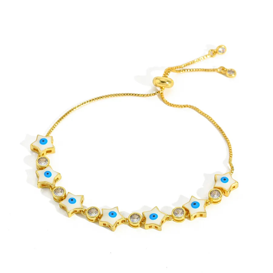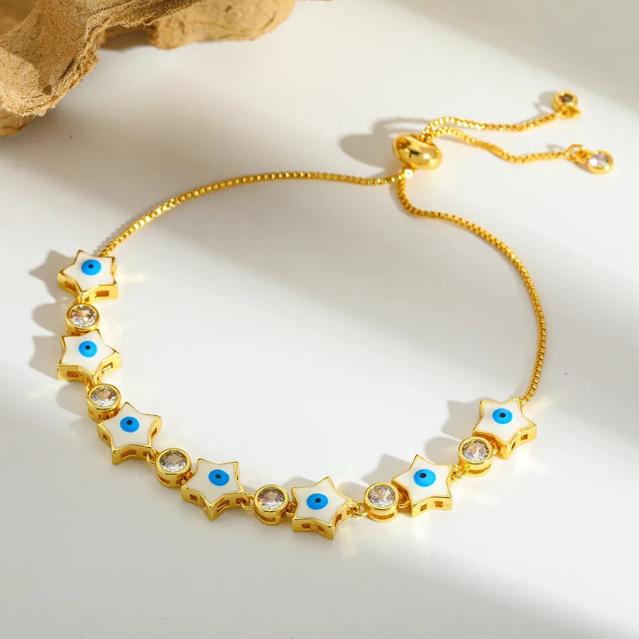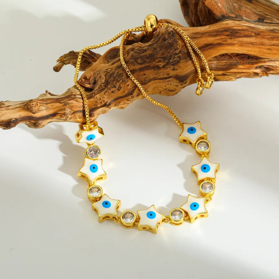 Star & Eye Rhinestone Bracelet | 18K Gold Plated Copper Women’s Stretch Adjustable Box Chain | Casual Novelty Jewelry