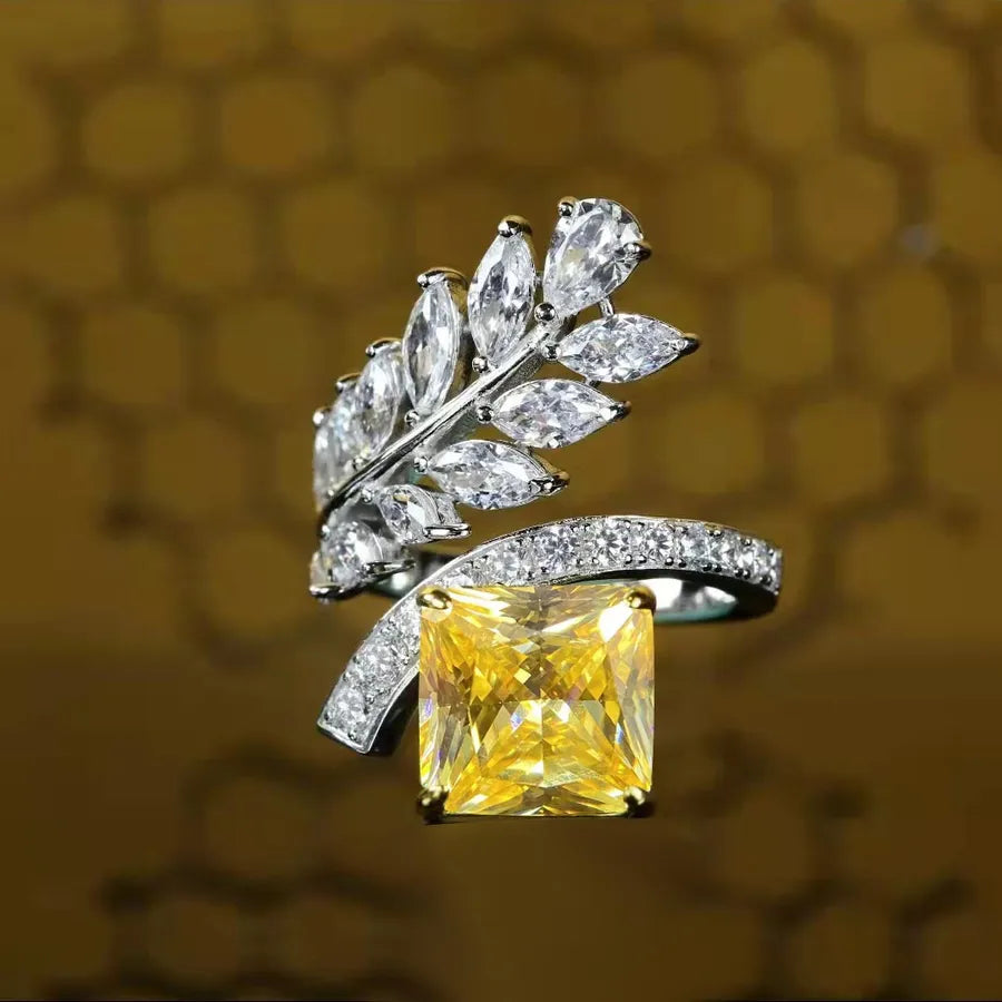 Ice Flower Copper Ring – Inlaid Leaf Zircon with Yellow Diamond