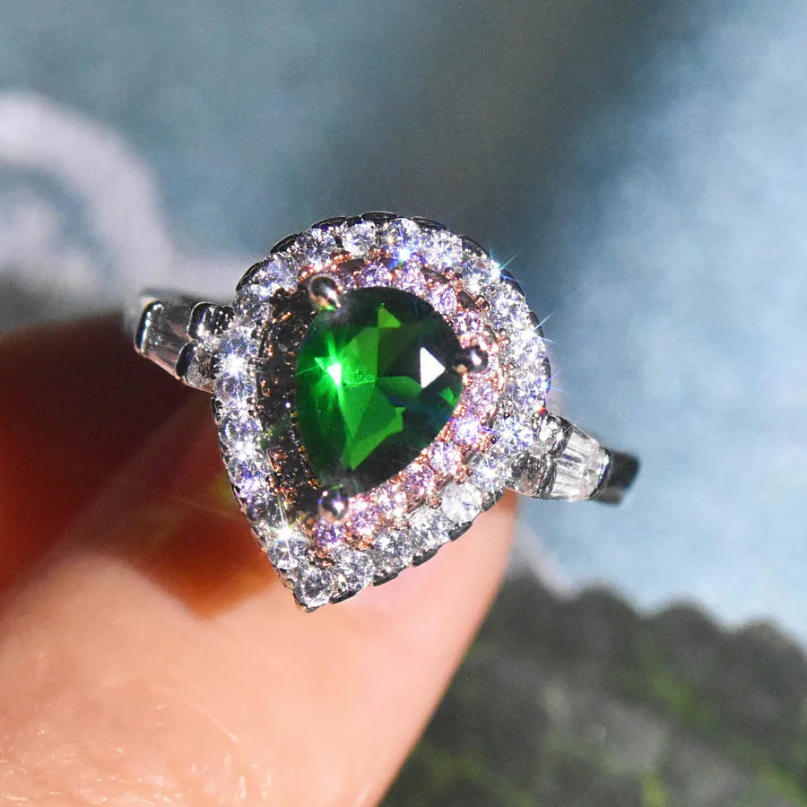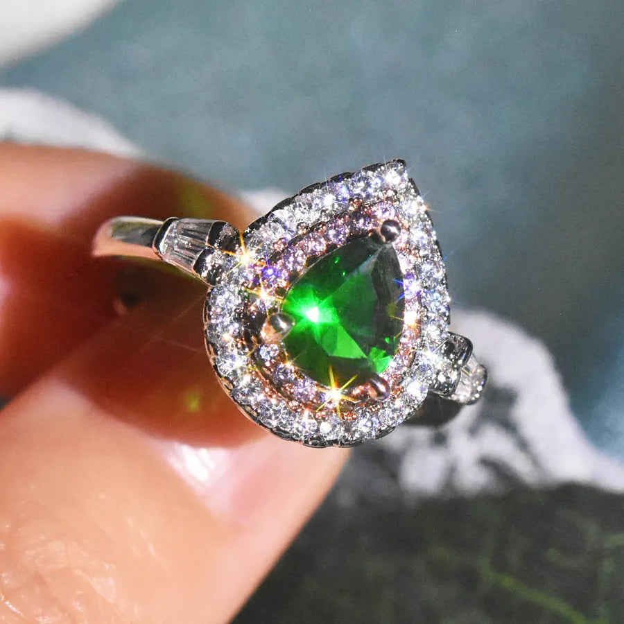 Green Water Droplets Ring for Women | Simple Style Copper Ring with Artificial Gemstones | Wedding Jewelry