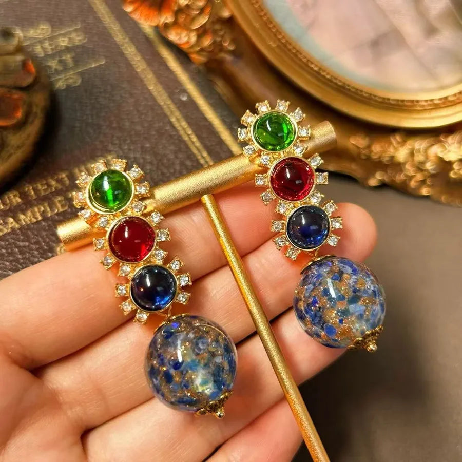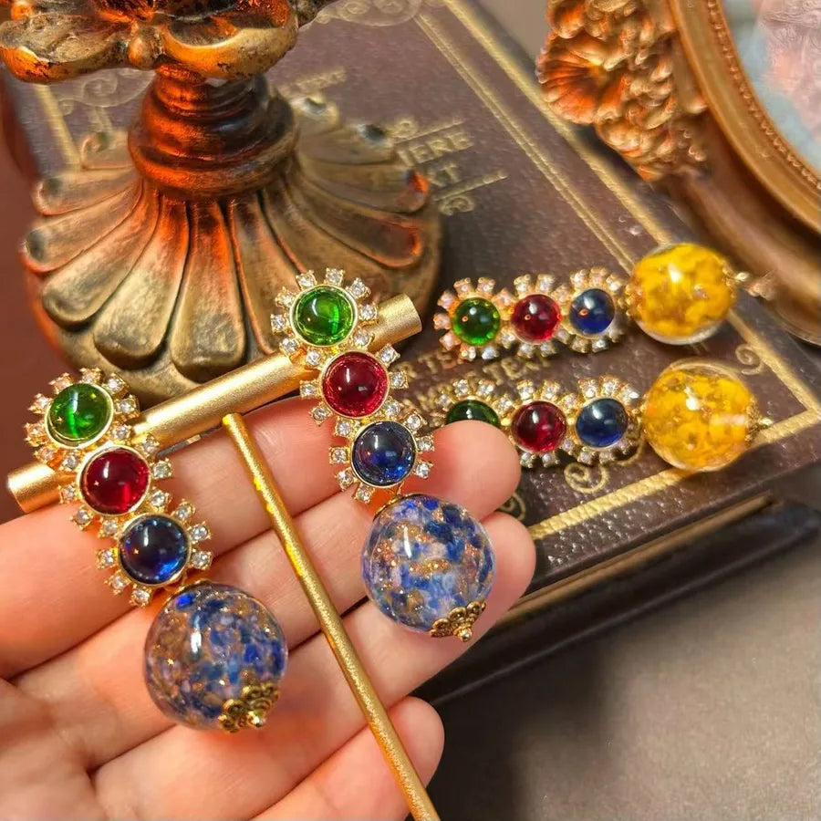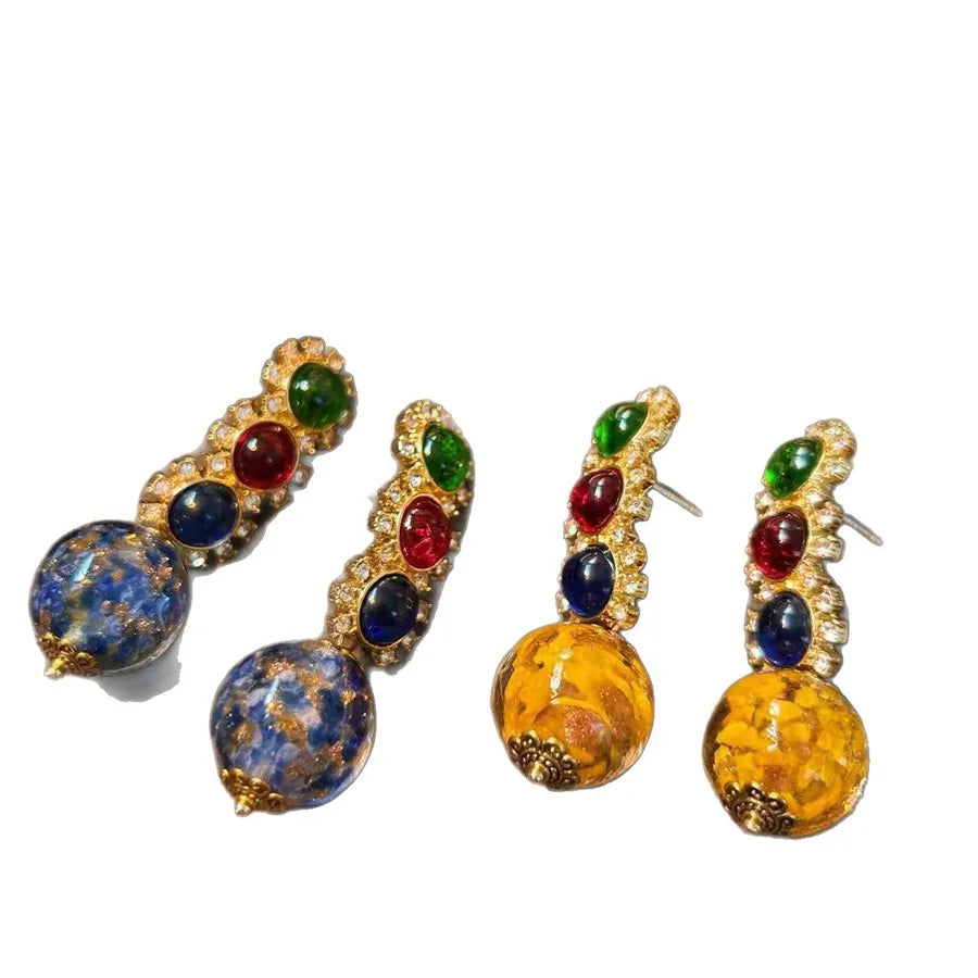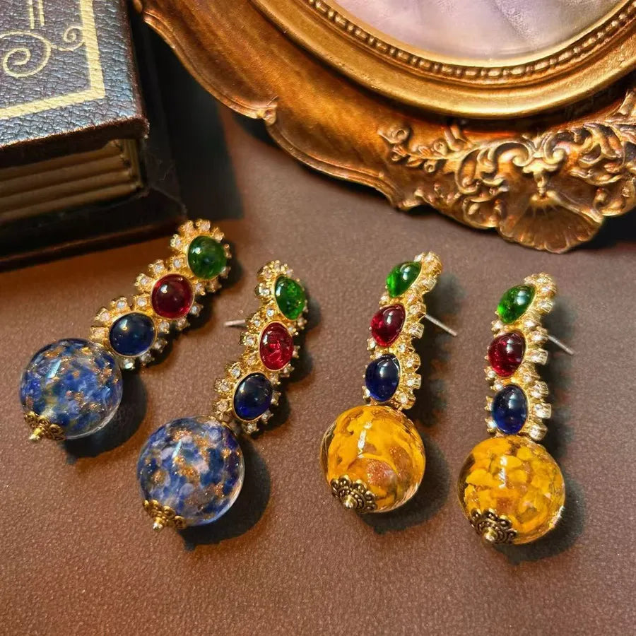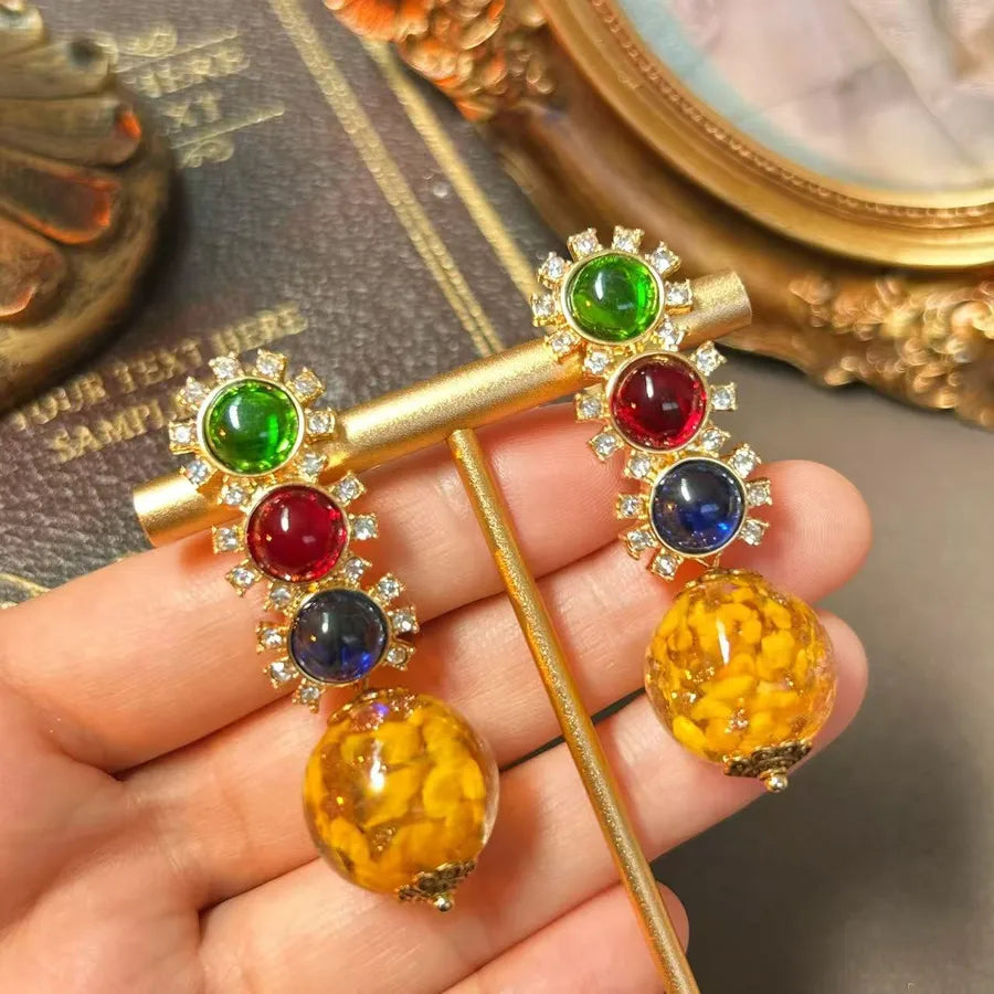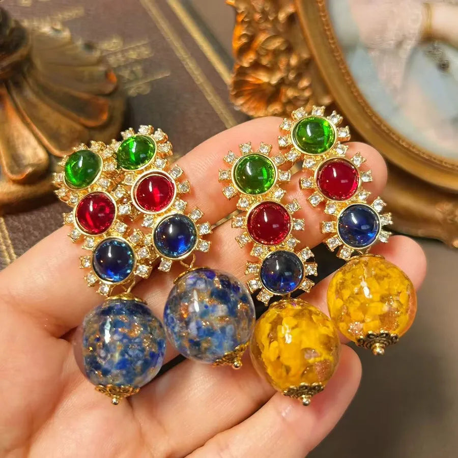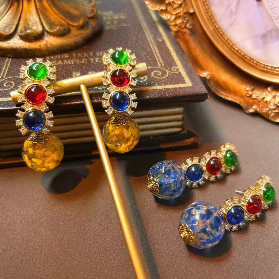 Dopamine Fashion Victoria Glass Vintage Sweet Court Elegant Earrings Geometric Pattern Dangle Hoops Diamond Embedded Gold Plated