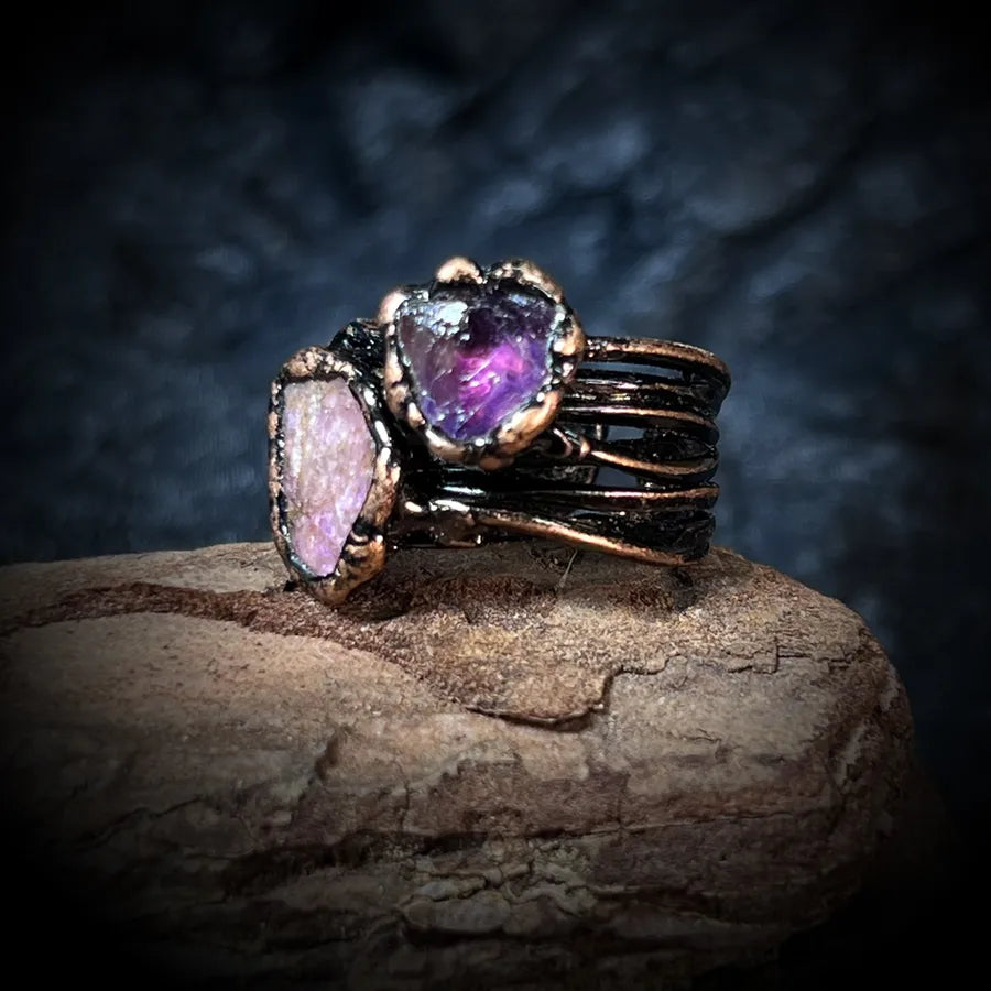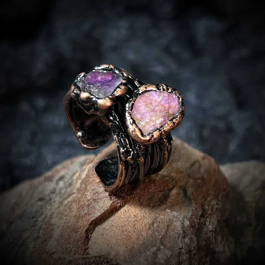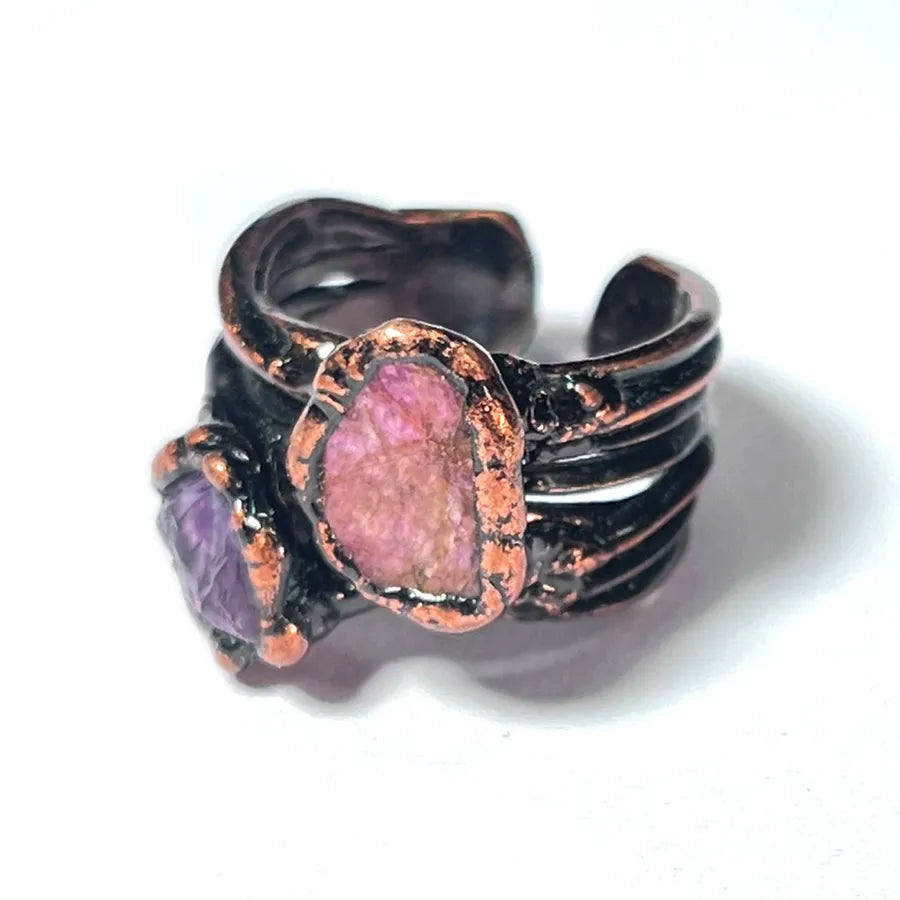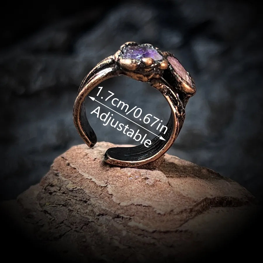 Adjustable Geometric Amethyst & Ruby Rough Stone Healing Open Ring | Elegant Retro Copper Unisex Ring | Casual & Street Jewelry