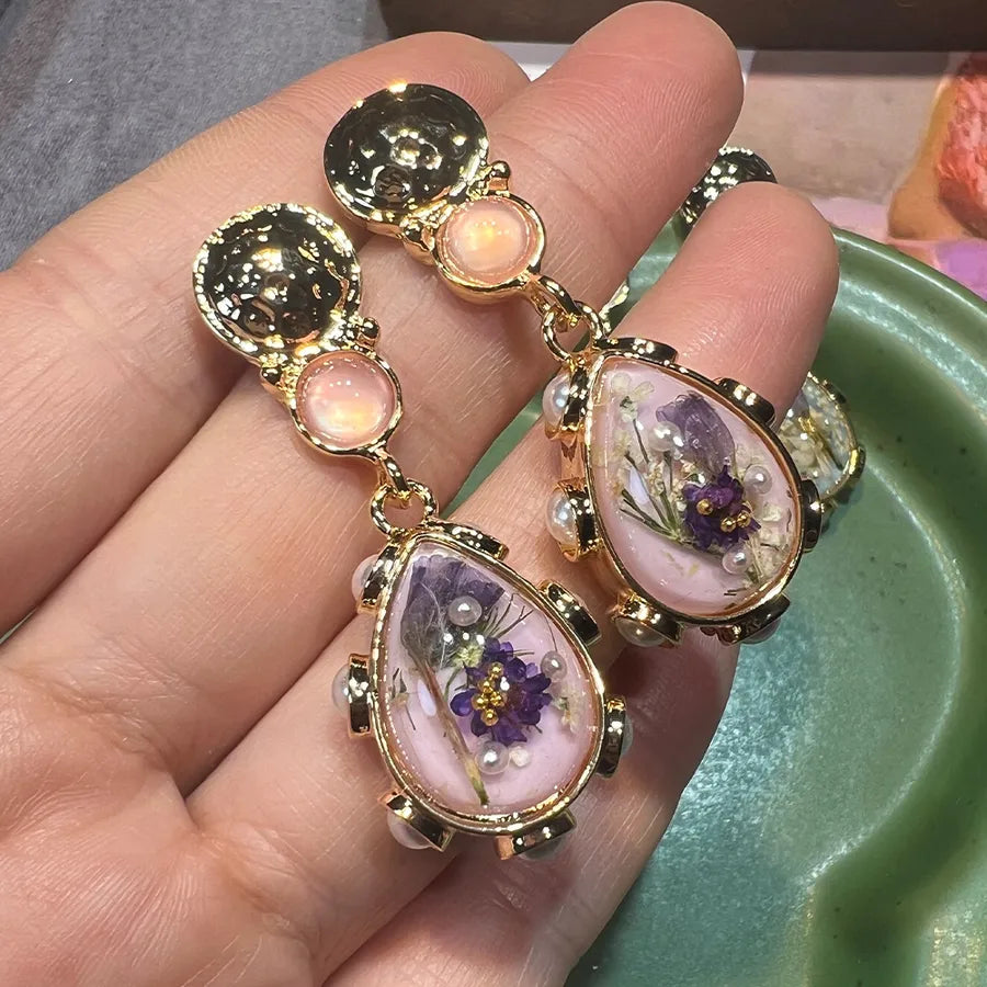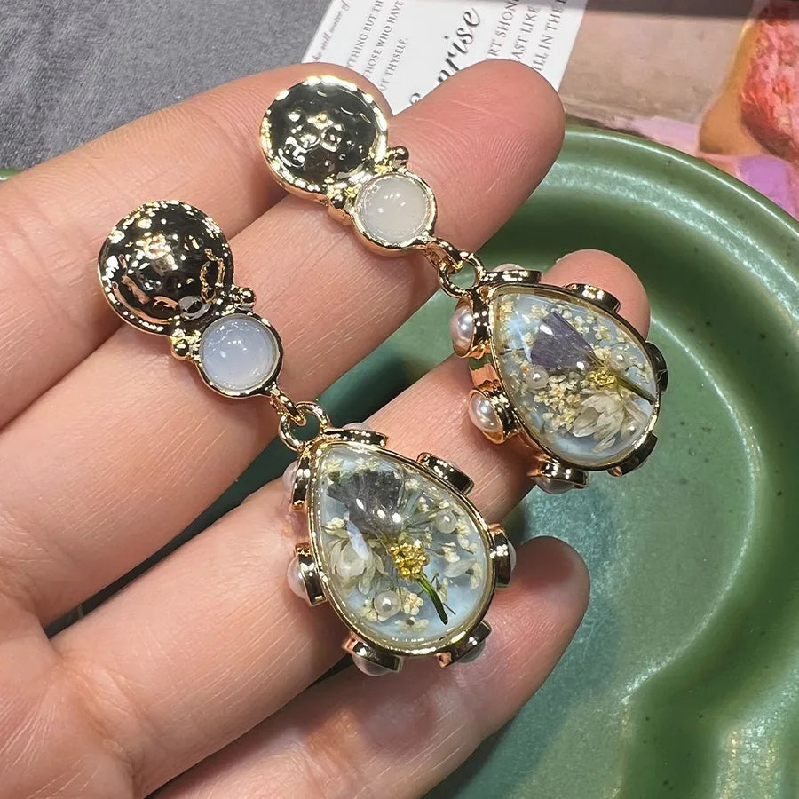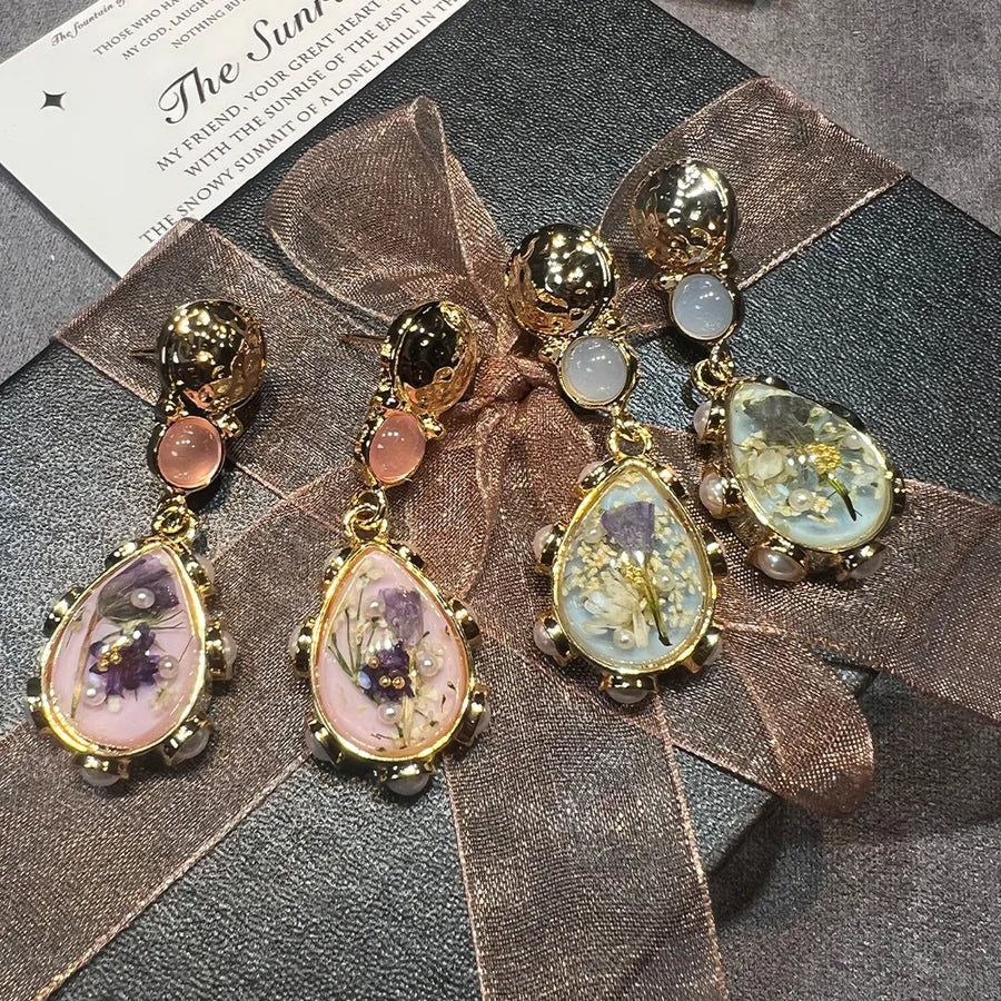 New Style S925 Gold Plated Amber Dried Flower Waterdrop Earrings Trendy Design French Vintage Copper Jewelry For Women